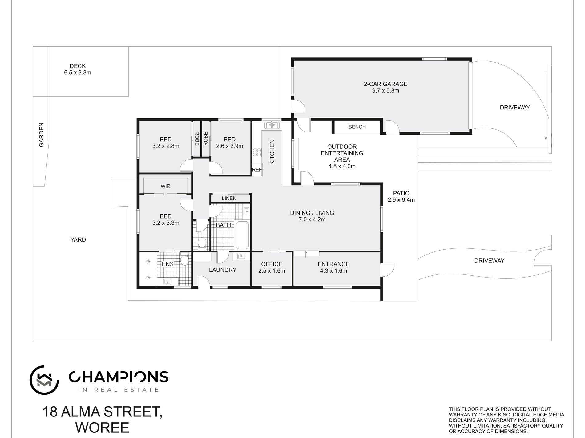 Master bedroom with walk in robe and ensuite, 2 other bedrooms with built in robes and a separate office.