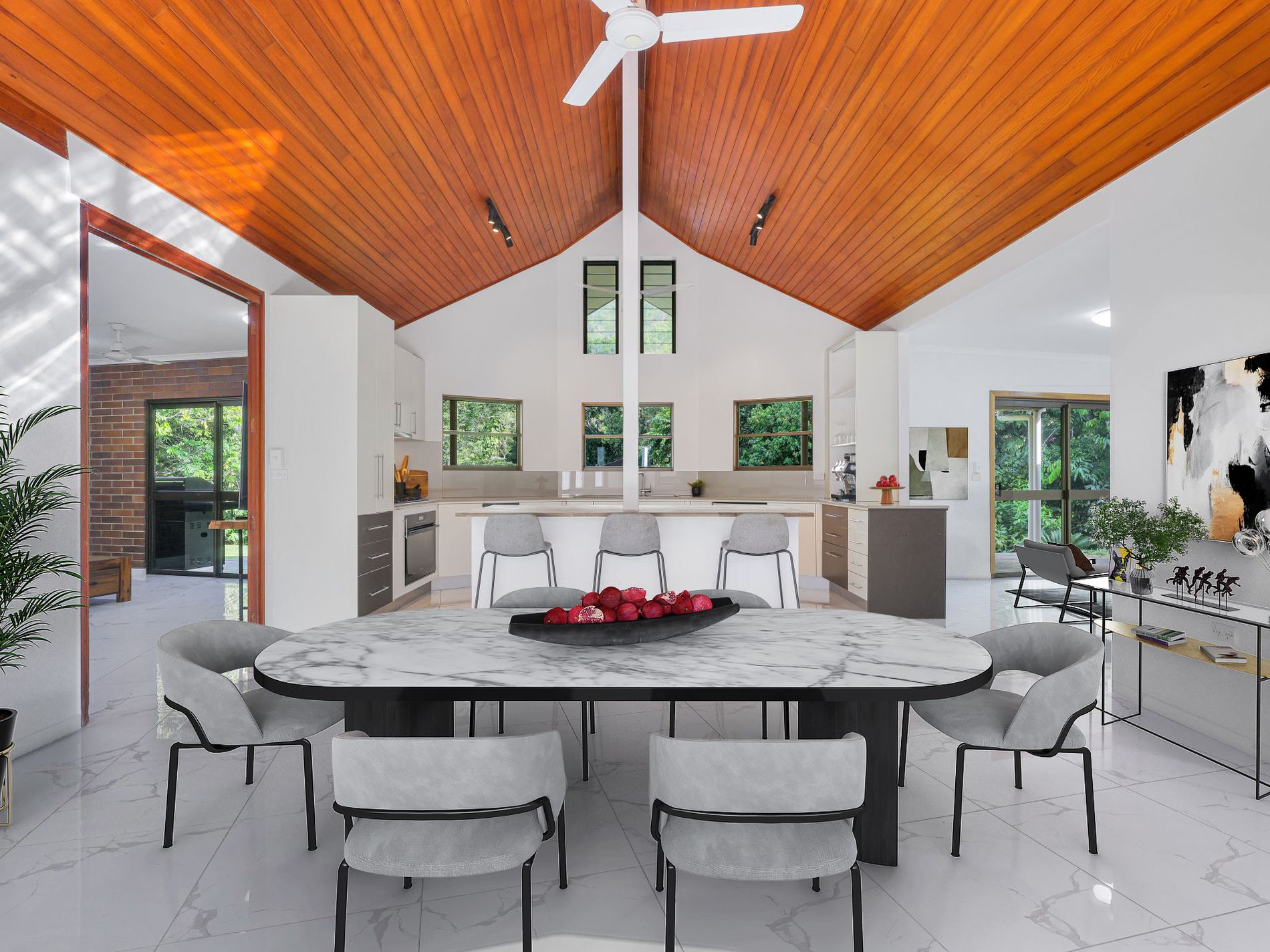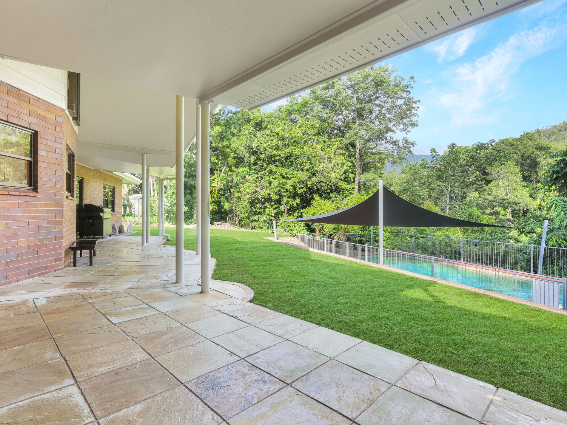 Expansive interiors flow seamlessly to the outdoor entertaining area, overlooking the sparkling pool and framed by lush greenery and mountain backdrops — tropical North Queensland living at its finest.