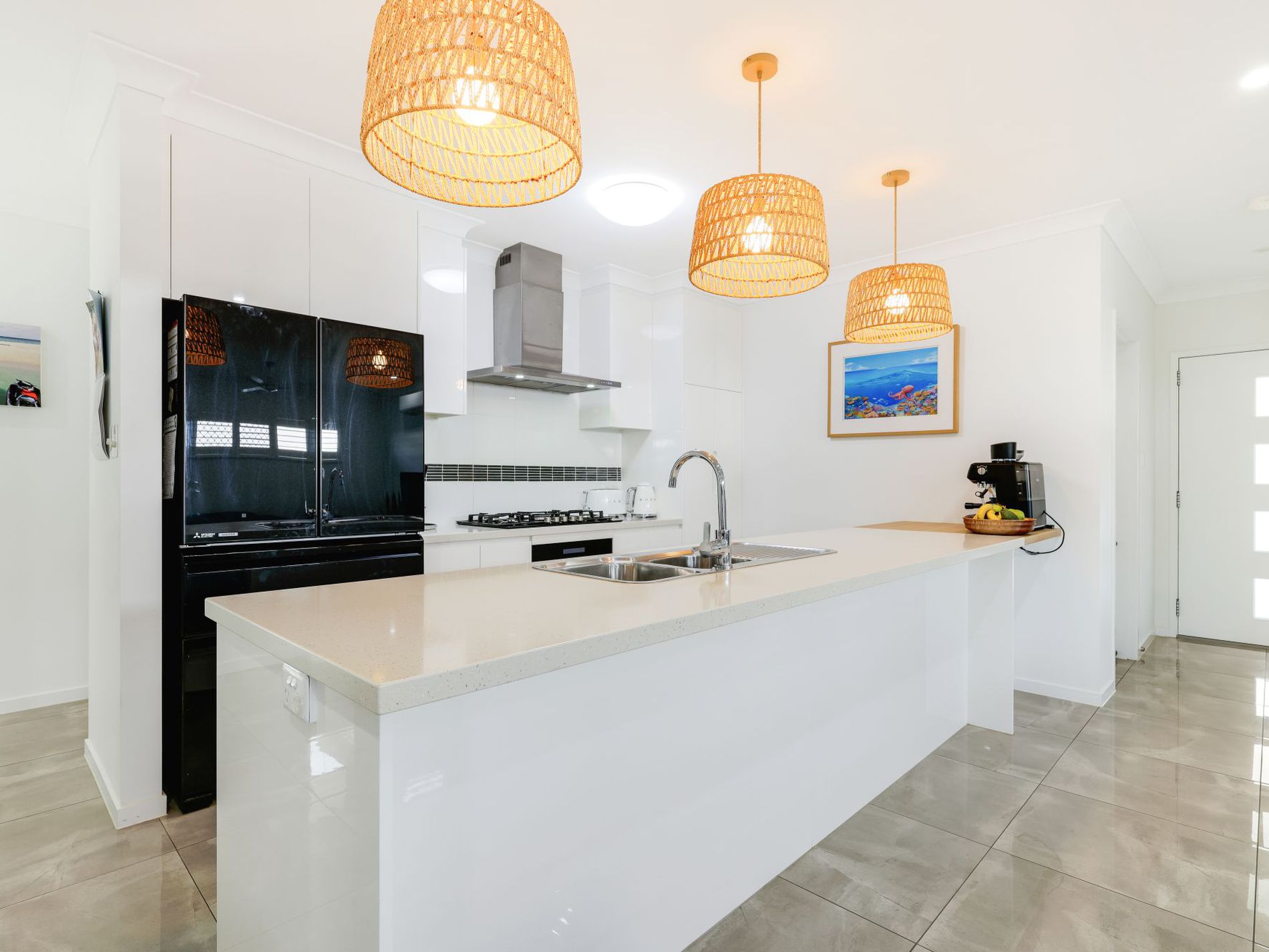 Centrally positioned, the sleek galley-style kitchen features a pantry, gas cooktop and dishwasher, perfectly placed to service the open-plan living and dining zones.