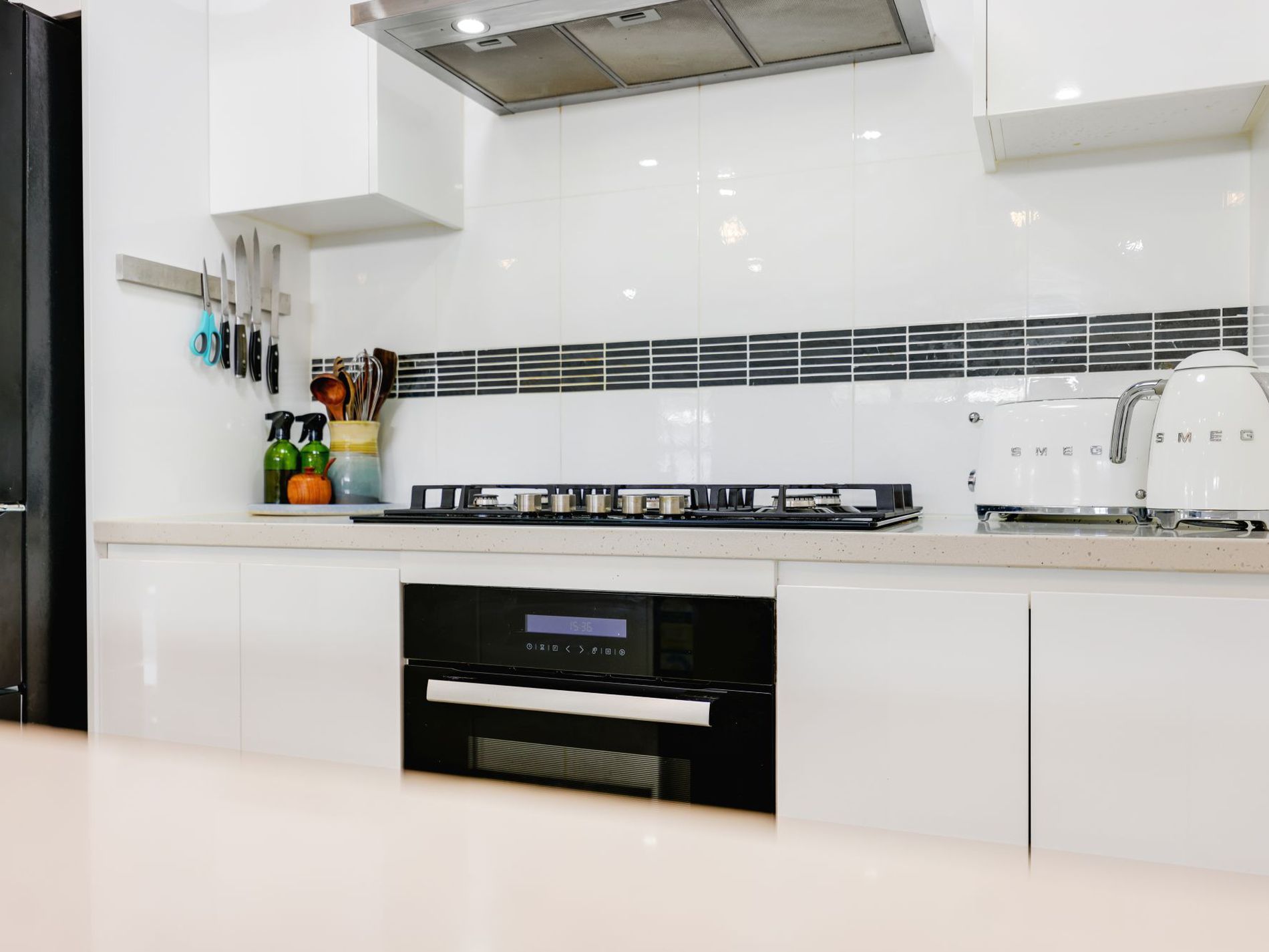 * Sleek modern galley style kitchen with pantry, gas cooktop and dishwasher