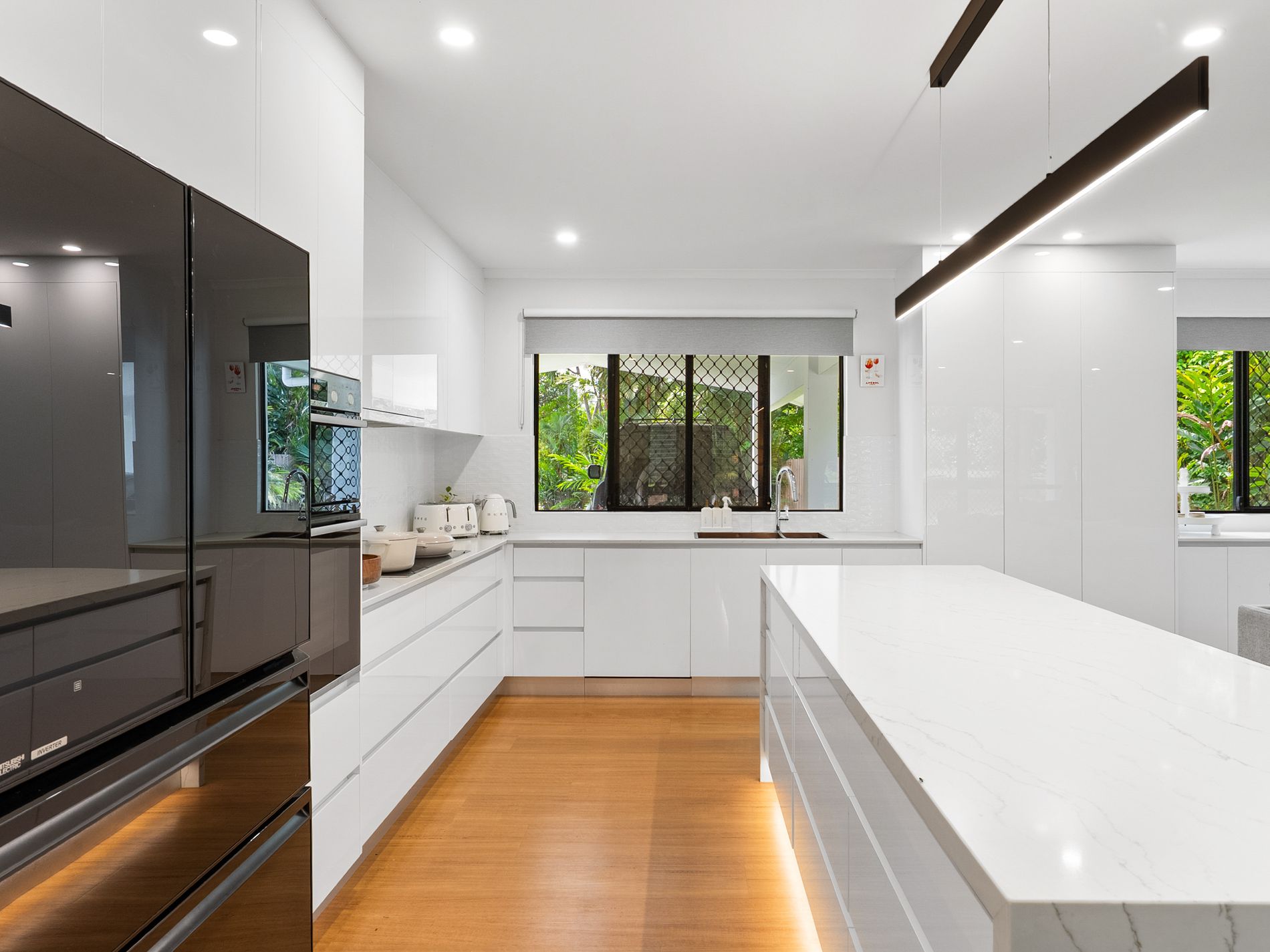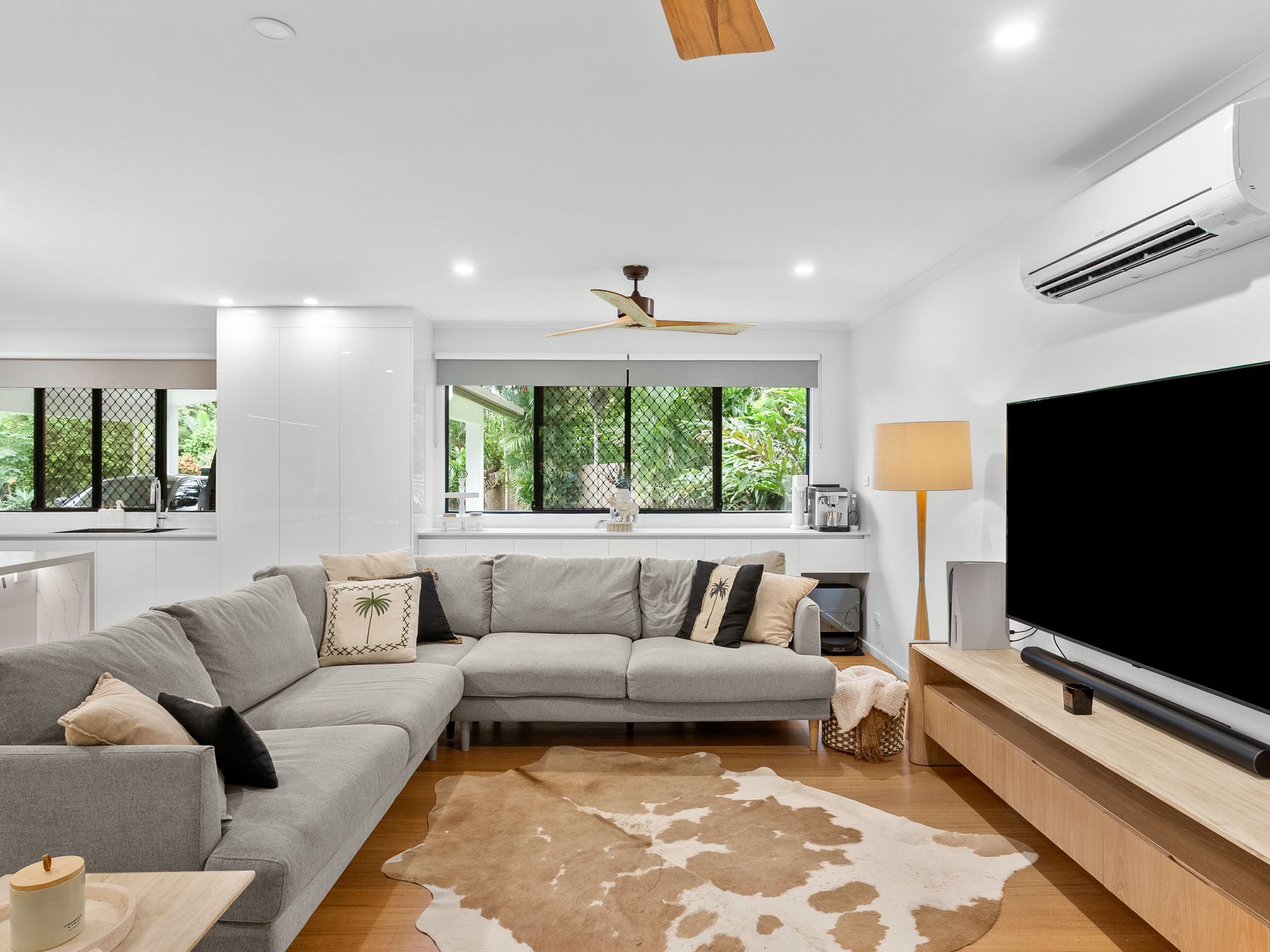 * Single-level design with open-plan living and floor-to-ceiling glass louvres framing lush, private surrounds